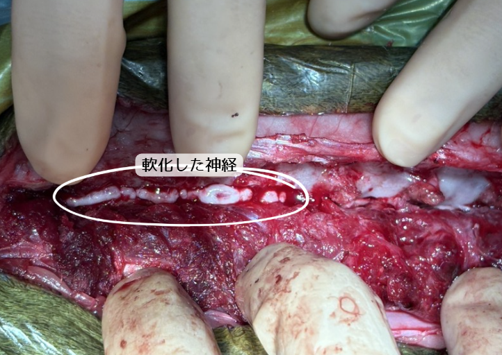 手術中には、すでに実際に軟化が始まっている脊髄組織を目視で確認。